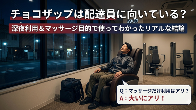 チョコザップは配達員に向いているのか。深夜利用やマッサージチェア目的でも元は取れるのか。実際に使った体験をもとに、向いている人・向いていない人、家トレとの違いまで整理する。